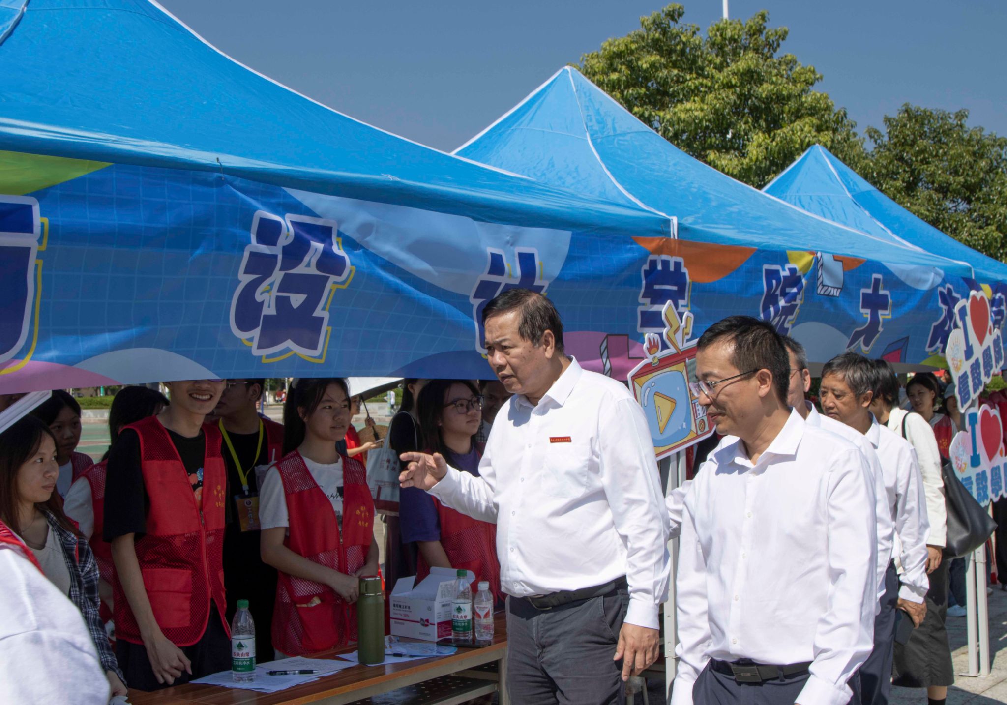 學校領導高度重視本屆運動會,在賽事開展期間,到現場檢查指導工作,保證賽事順利開展,與志愿者們親切交談并為運動健兒們加油助威。