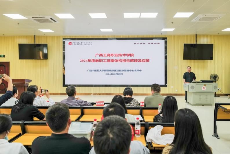 活動(dòng)首先由廣西中醫(yī)藥大學(xué)附屬瑞康醫(yī)院農(nóng)澤寧主任醫(yī)師結(jié)合2024年體檢結(jié)果作健康講座,針對體檢排名前十項(xiàng)的異常結(jié)果進(jìn)行了分析,對這些疾病產(chǎn)生的原因、癥狀、危害及預(yù)防措施進(jìn)行了詳細(xì)的講解,并對教職工們出現(xiàn)的亞健康問題給出合理化的指導(dǎo)建議。
