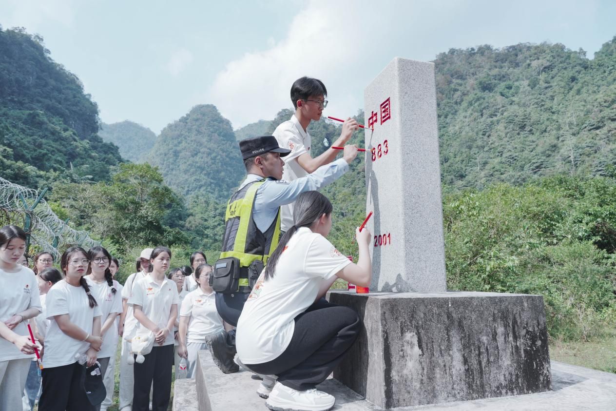在邊境線上,師生們沿著崎嶇不平的山路,在金龍鎮邊境警官們的帶領下開啟了一場意義非凡的巡邊體驗。這段艱難的路程不僅是一次身體上的考驗,更是對意志力的一次磨煉,讓大家深刻體會到守護邊境安全的戰士們每日巡邏所付出的艱辛。當一步步靠近883號界碑時,每個人的內心都充滿了激動與自豪。通過黃警官的詳細講解,大家對883號界碑有了更深入的了解,對其背后的意義也有了更加清晰的認識。在界碑前,全體師生一起重溫了入團誓詞,鏗鏘有力的“為共產主義事業而奮斗”誓言回蕩在邊境上空,表達了新時代青年守好祖國南大門的堅定決心。