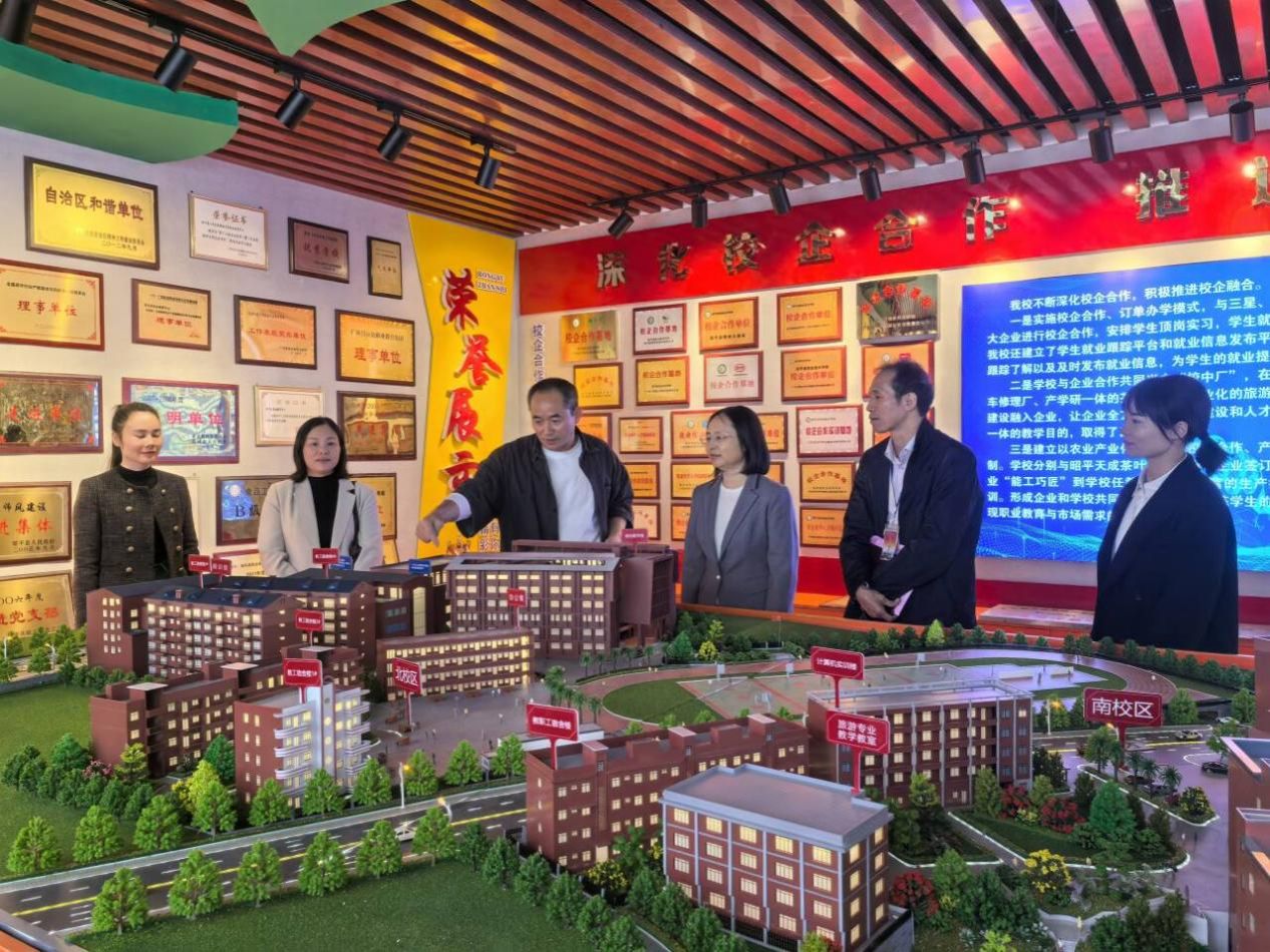 座談會后,韋云鳳一行參觀了昭平縣職業技術學校的圖書閱覽室、校史榮譽室、茶文化展廳和校企合作雙主體辦學產業化實訓基地等,進一步了解該校的發展規劃、辦學條件和校企合作成果。
