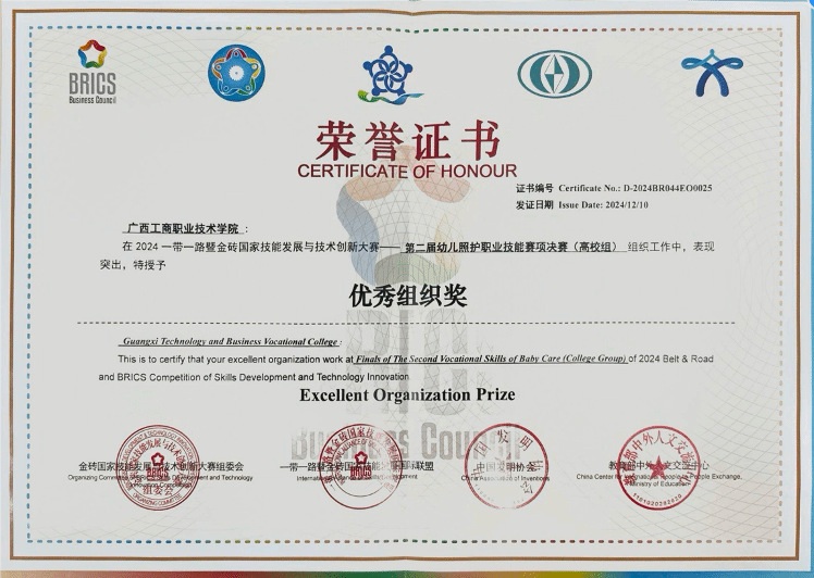 12月7日-9日,2024年一帶一路暨金磚國家技能發展與技術創新大賽第二屆幼兒照護職業技能賽項全國總決賽(高校組),在湖南岳陽職業技術學院舉行,來自全國80支參賽隊,160名選手同臺競技。經過三天的激烈比賽,學校糧油康旅學院幼托2301班學生李巧婷和幼托2302班蔣婷,通過扎實的專業知識和出色的實操技能,在眾多參賽隊伍中脫穎而出,以總排名第九,獲得國賽二等獎的好成績,教師吳小梅、黃文健榮獲優秀指導教師,學校獲得優秀組織單位。