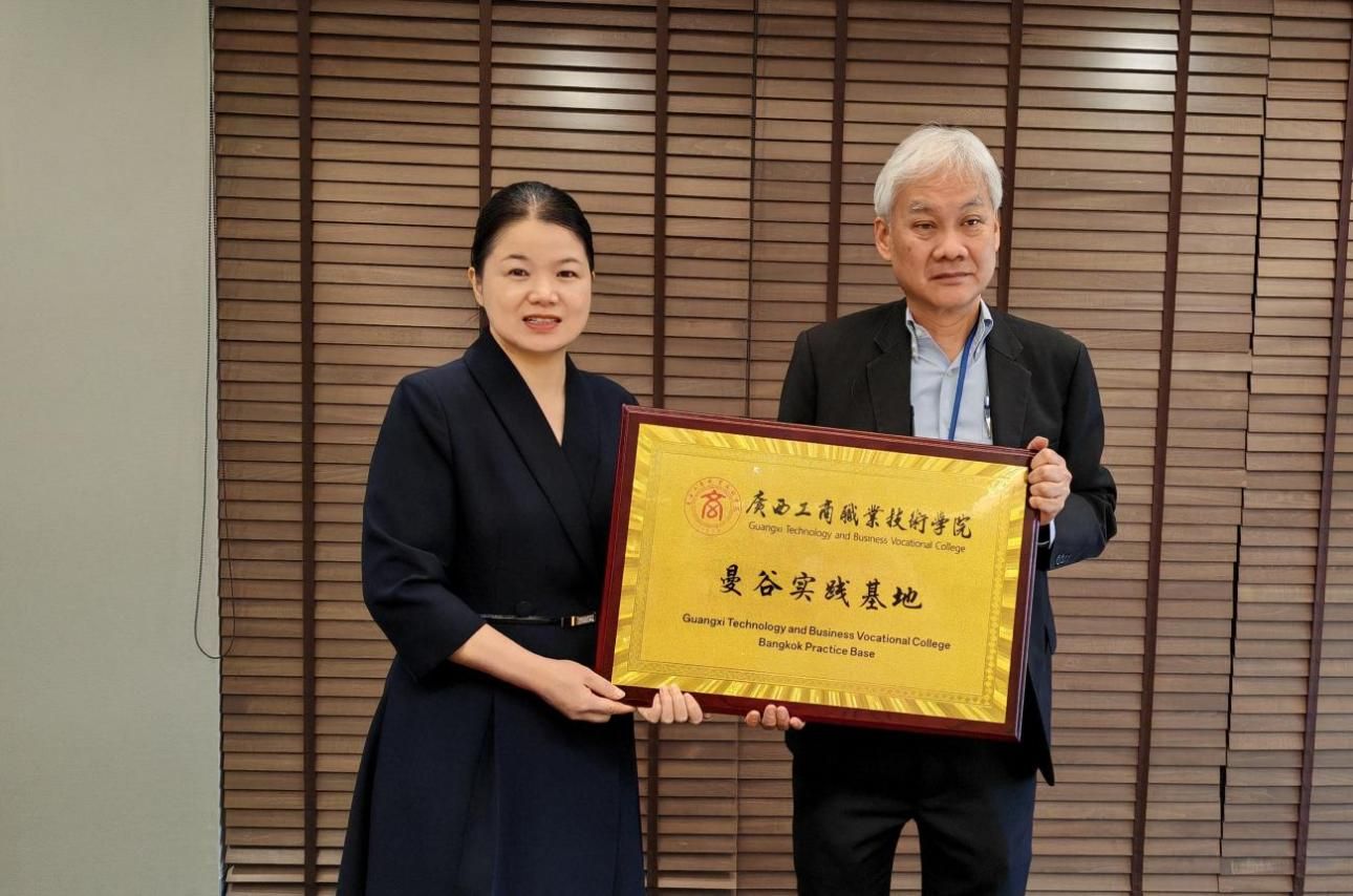 (廣西工商職業技術學院曼谷實踐基地授牌儀式。圖右為泰國正大管理學院副校長Somrote Komolavanij(宋洛)教授)