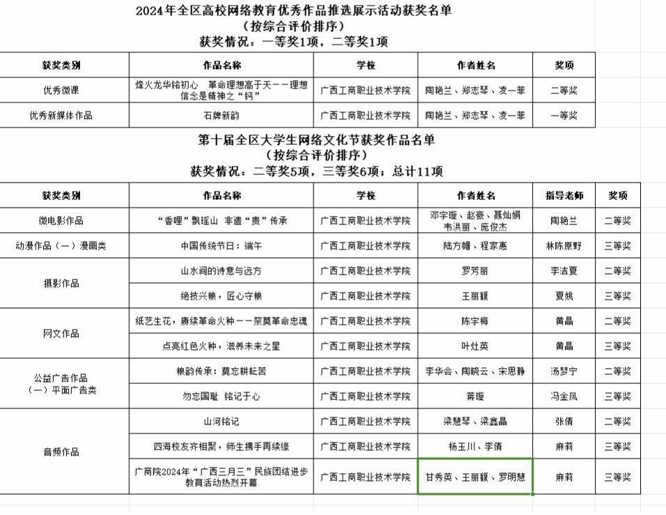 近日,自治區教育廳和自治區黨委網信辦公布第十屆全區大學生網絡文化節和2024年全區高校網絡教育優秀作品推選展示活動獲獎名單,我校在優秀微課、優秀新媒體作品、微電影、漫畫、攝影、網文、公益廣告、音頻等8類作品的征集中榮獲13個獎項,其中一等獎1個、二等獎6個、三等獎6個。