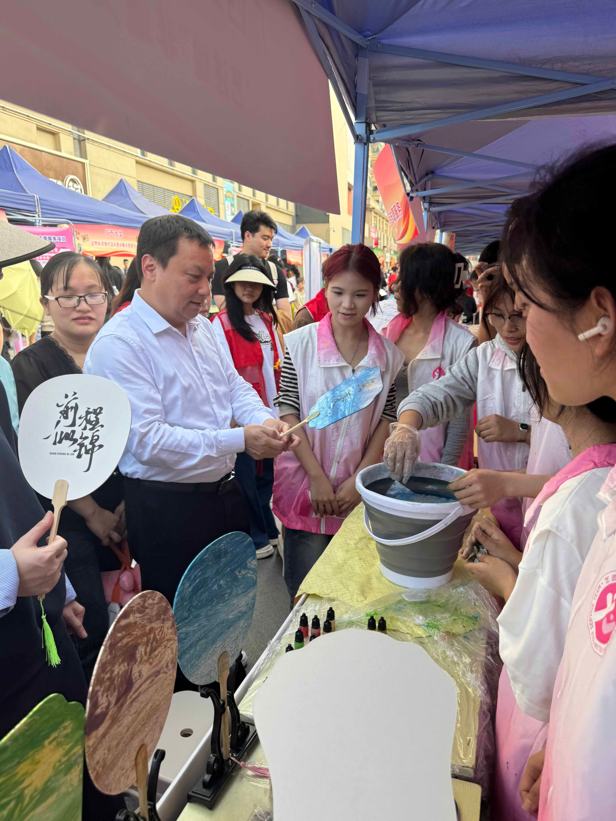 南寧市社會工作部副部長陳仕成來到學校“藝述繪”青年志愿服務隊的攤位進行活動體驗。他對我校志愿者的熱情服務和創新精神給予了高度評價,并表示這樣的活動不僅有助于傳承和弘揚傳統文化,還能夠增強市民的志愿服務意識,推動社會文明進步。