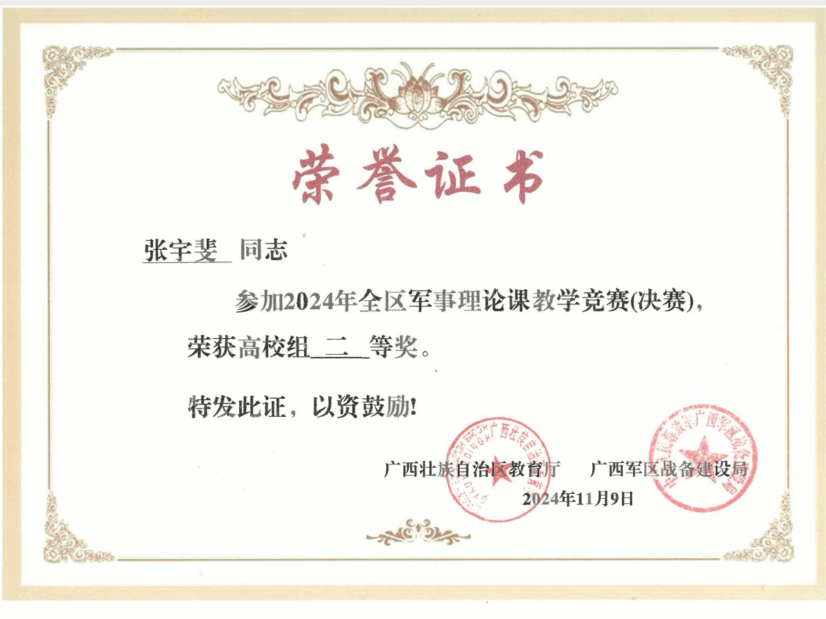2025年3月5日至7日,廣西高校國防教育學會年會暨2025年工作會議在河池市召開。會議頒發了2024年軍事課教學競賽獲獎證書,我校張宇斐、練東曦兩位教師均榮獲二等獎,謝榮坤老師榮獲三等獎。我校張宇斐、練東曦老師參加會議并在會議上領取了由廣西壯族自治區教育廳、廣西軍區戰備建設局相關領導頒發的獲獎證書。