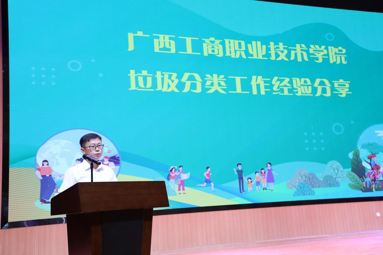南寧市武鳴區住房和城鄉建設局副局長梁鵬昌作生活垃圾分類工作經驗分享,向與會人員介紹了“政府主導、部門協同、社會參與、全民行動”的垃圾分類工作格局。我校后勤管理處處長林昆榮作垃圾分類工作經驗分享,介紹學校垃圾分類工作具體做法,為大家提供了可復制的經板模板和多元化的垃圾分類工作思路。