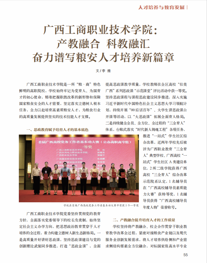 近日,《中國糧食經(jīng)濟》刊發(fā)學校黨委書記李維署名文章,標題為《廣西工商職業(yè)技術(shù)學院:產(chǎn)教融合 科教融匯 奮力譜寫糧安人才培養(yǎng)新篇章》,全文如下: