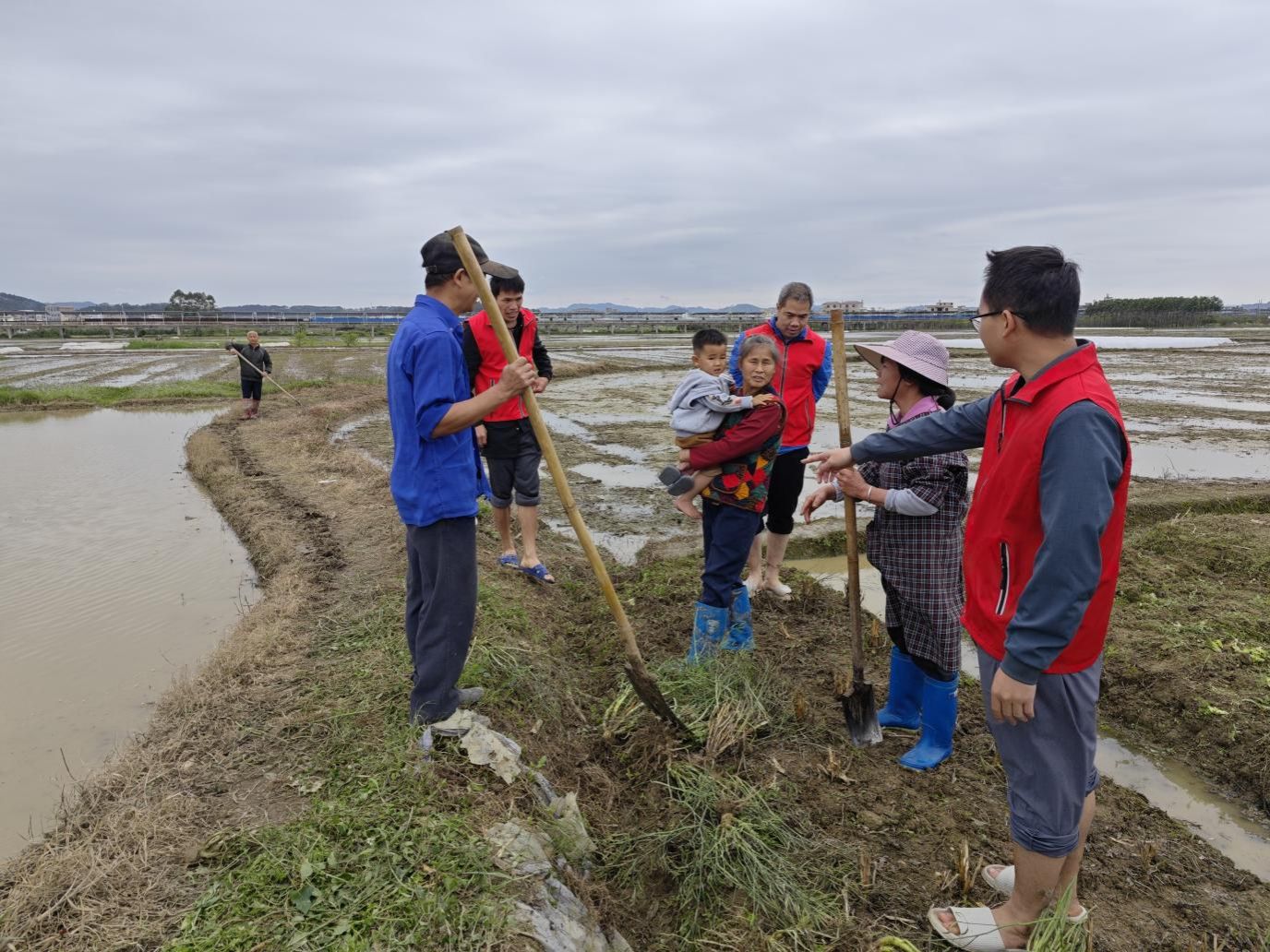 (莫小強(右一)與四樂村駐村工作隊到田間和群眾了解春耕情況)