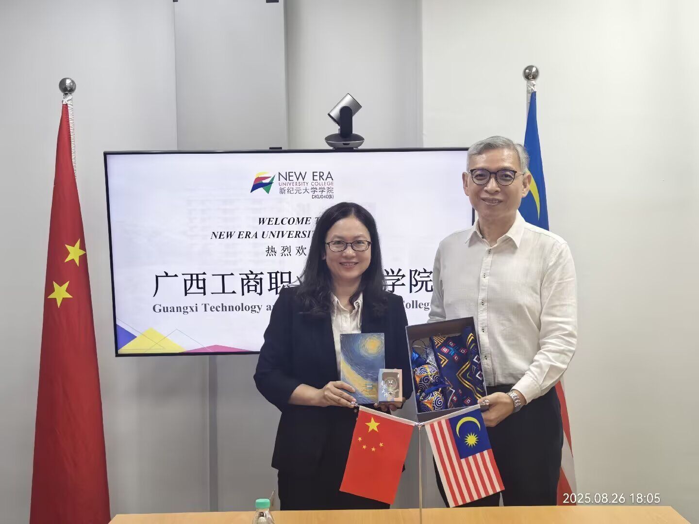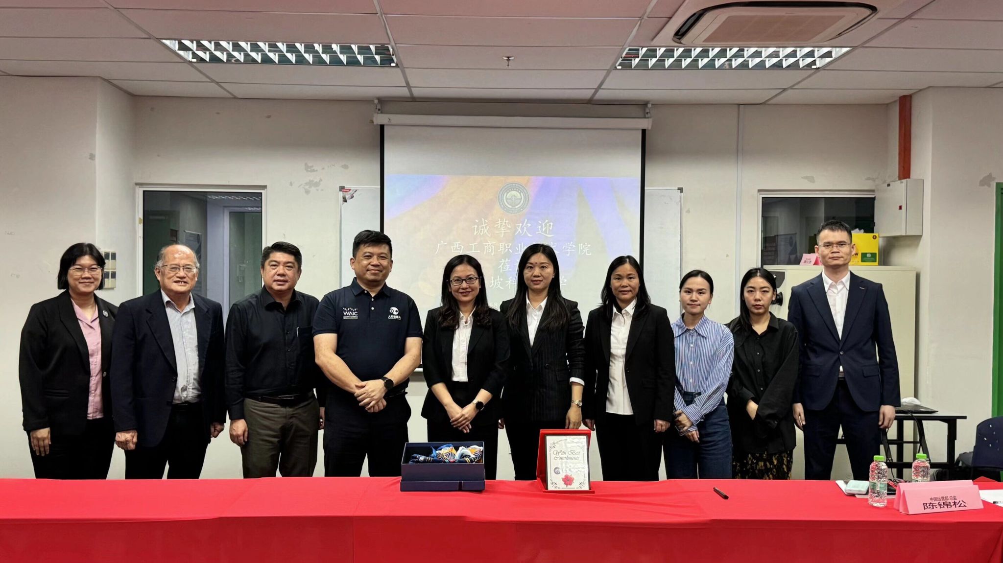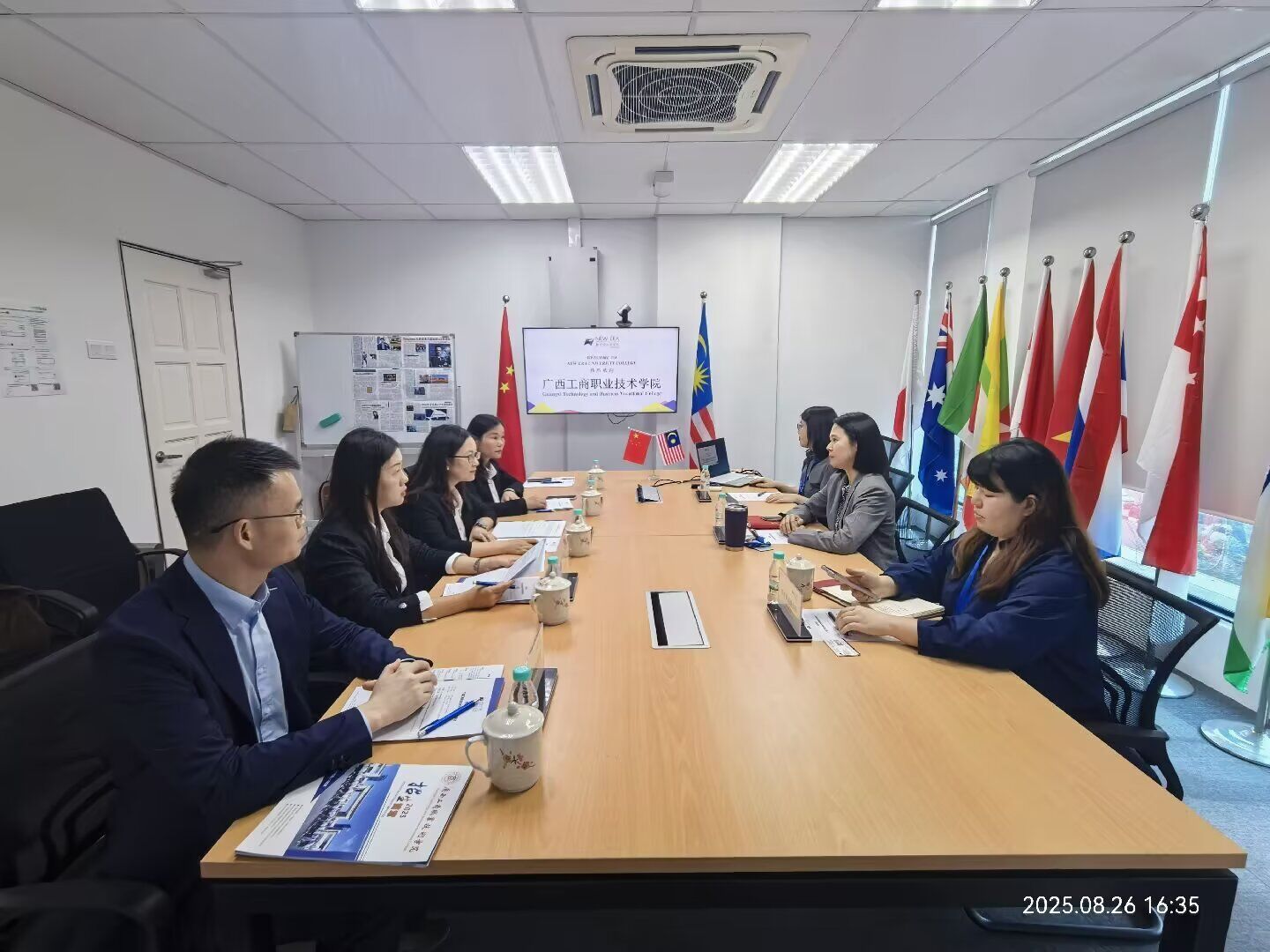 訪問新紀元大學學院時,代表團與該校校長莫順宗教授、副校長鄭詩儐副教授、國際教育學院助理院長廖筱紋副教授、國際學生招生辦公室主任彭會婷高級講師等校方代表座談交流。雙方通過視頻展示辦學特色,重點探討中國-東盟現代工匠學院共建、國際化課程開發、教育人才聯合培養、學術及師生交流、學歷提升等合作方向。兩校專業設置契合度較高,為合作奠定良好基礎,雙方達成合作意向,并計劃后續簽訂框架協議,實現資源共享與優勢互補。