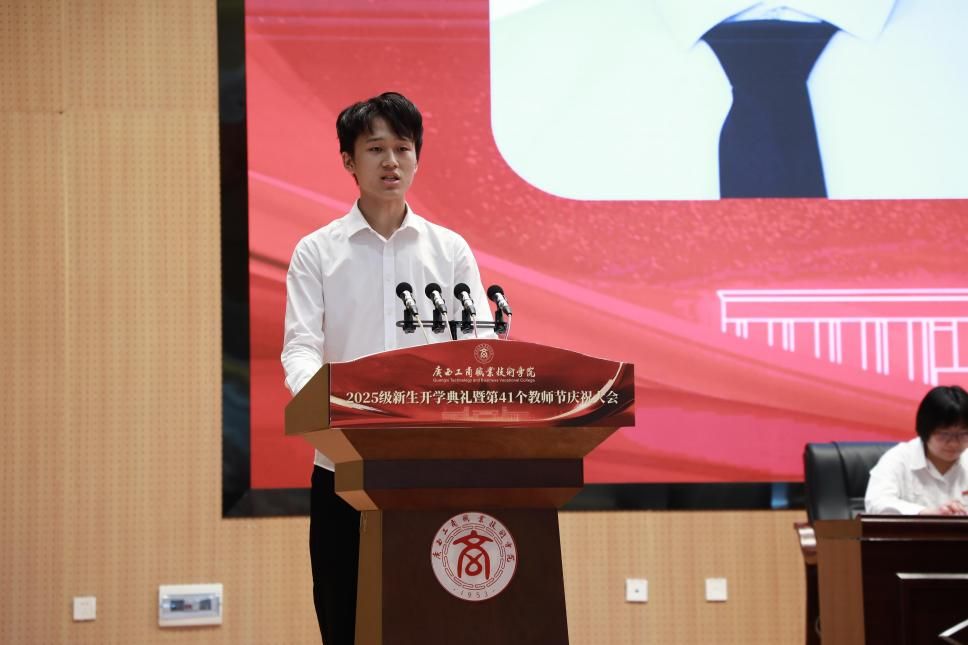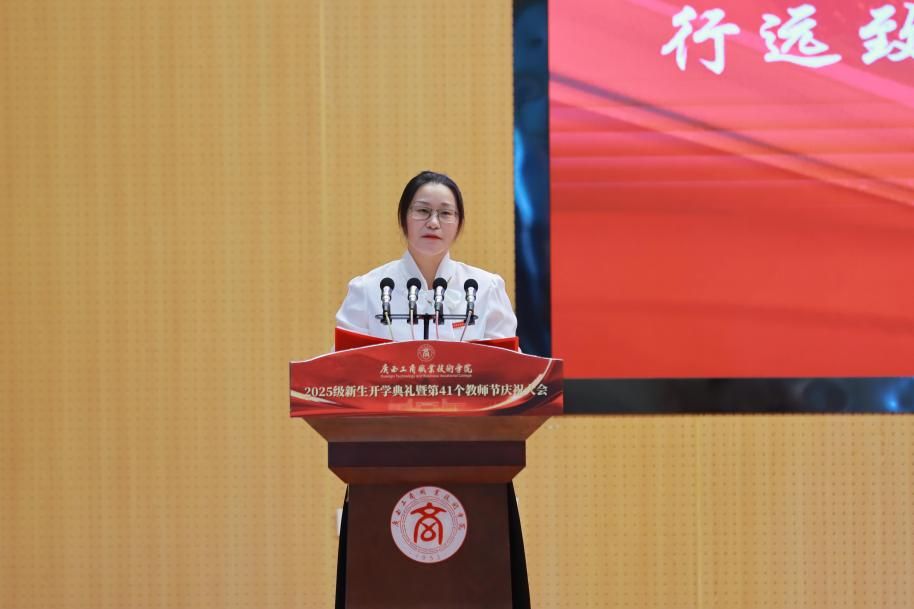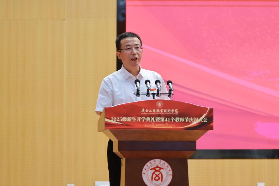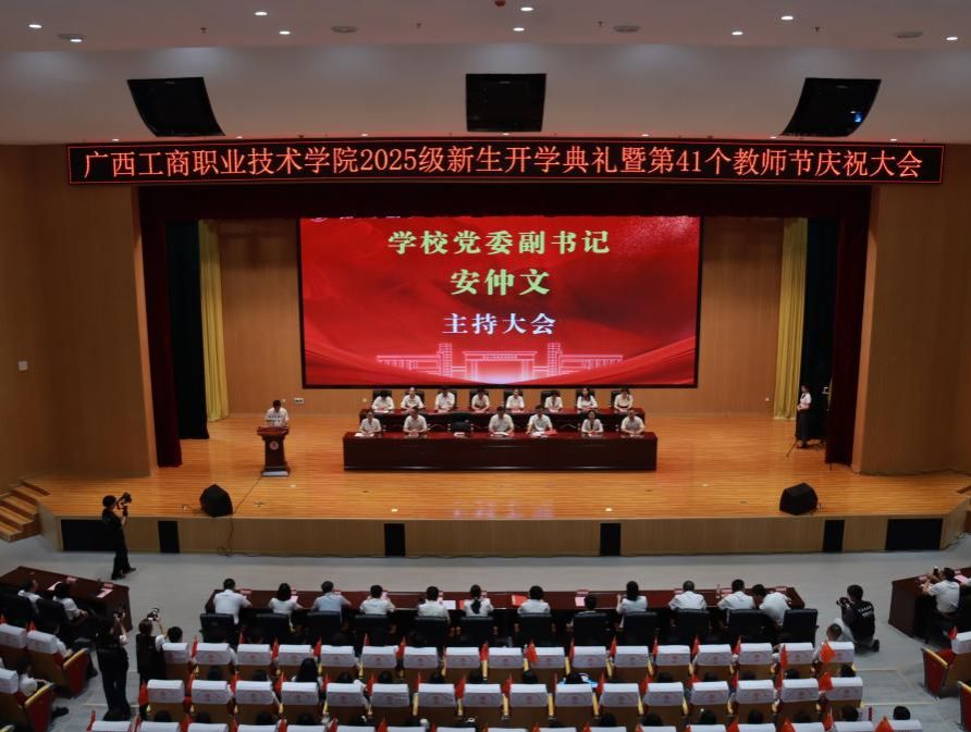 為熱烈歡迎2025級新生入學,隆重慶祝第41個教師節,9月10日,學校以線上線下相結合的方式在武鳴校區、鵬飛校區、中堯校區同步舉行2025級新生開學典禮暨第41個教師節慶祝大會。學校領導李維、劉進、安仲文、韋云鳳、陳寧春、闕勇平、鄭華,各部門、各單位主要負責人,受表彰教師代表,新入職教師代表,武鳴校區2025級輔導員代表和2025級新生代表在線下主會場參會,全體2025級新生及各部門、各單位教職工在線上參會。學校黨委副書記安仲文主持大會。