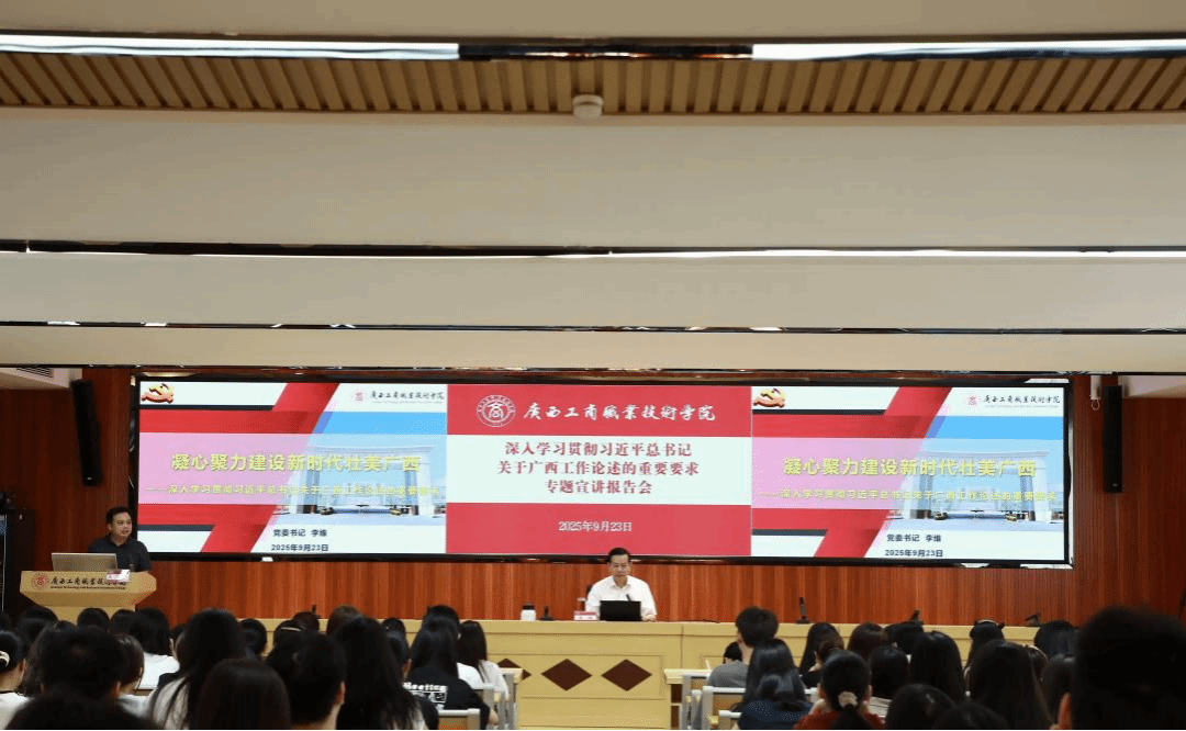 為深入學習貫徹習近平總書記關于廣西工作論述的重要要求,鑄牢中華民族共同體意識,推動黨的創新理論有效觸達青年群體,根據自治區黨委宣傳部《理論宣講青年群體全覆蓋三年行動計劃工作方案》安排,9月23日,學校在鵬飛校區舉辦深入學習貫徹習近平總書記關于廣西工作論述的重要要求專題宣講報告會,學校黨委書記李維作題為《凝心聚力建設新時代壯美廣西——深入學習貫徹習近平總書記關于廣西工作論述的重要要求》的專題宣講報告。宣講報告會采取線下講授、線上直播結合的形式展開,全體在校生聽取報告會。