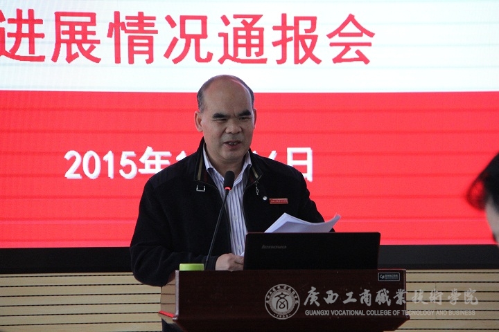 2015年12月16日下午2點40分我院在2119教室召開“三嚴三實”專題教育進展情況通報會。學院黨委書記覃武云、學院院長陳杰、副廳級調研員黃永蓬和學院全體在職黨員、學院副高職稱及以上教師、學院教代會代表等參加了會議。會議由陳杰院長主持,覃武云書記做專題報告。