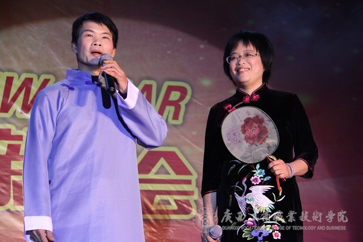 現(xiàn)場華燈璀璨,熱鬧非凡。晚會伊始,主持人向大家介紹了到場的學(xué)院領(lǐng)導(dǎo)、嘉賓及教師等,接著由黨委書記覃武云做新年賀辭,他代表學(xué)院黨委向全體師生致以誠摯的問候和新年美好祝福。