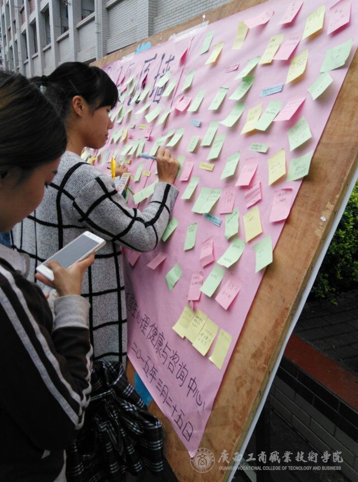 本次大學生心理健康與咨詢中心所舉行的現場宣傳活動吸引了很多同學的積極參與,他們或是認真觀看展板圖上的心理趣味圖、或是在心愿墻上美美的寫上自己心愿,或是興高采烈地領取充滿正能量的書簽或是在善愛自我,遠離網絡的橫幅上留下了自己的名字,活動還向全院同學們發出倡議 “生活離不開網絡,但網絡不是生活!”,各項活動得到了同學們的強烈響應,在簽名處擠滿了人,橫幅上密密麻麻的寫滿了字。同時本次活動設置了心理健康活動卡蓋章環節,這是心理健康教育課程的一次創新。