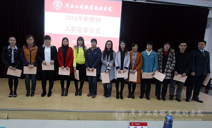 2016年2月26日上午,學院在校本部教學樓2145報告廳舉行2016年春季學期新教師入職宣誓儀式,學院領導班子成員以及全體教職工參加了儀式,由學院黨委副書記蒙啟成主持儀式。