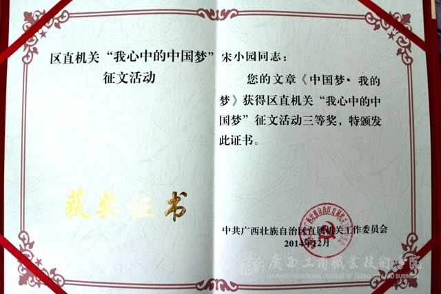 近日,從自治區區直機關工委傳來喜訊,我院12級會計系宋小園同學的文章《中國夢.我的夢》在區直機關“我心中的中國夢"征文活動中榮獲得三等獎,該文已被錄入《2014年區直機關我心中的中國夢征文集錦》當中。由于宋小園同學在外實習。目前,獲獎證書與400元獎金,以及該征文集錦已經由其學妹代為轉交。