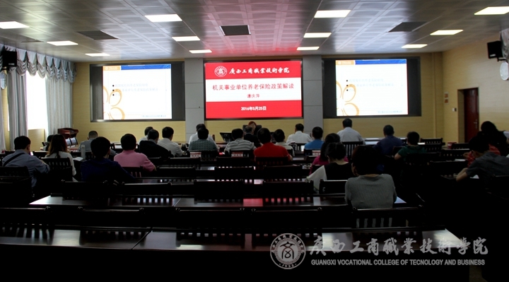 2016年5月25日下午,我院在校本部2119會議室舉辦機關事業(yè)單位養(yǎng)老保險政策解讀專題講座。學院黨委書記覃武云、院長陳杰、黨委副書記蒙啟成、副院長李仕欽、副院長李維、學院中層以上領導及業(yè)務部門工作人員參加了本次講座。本次講座由自治區(qū)社保局基本養(yǎng)老保險經辦管理處主任科員譚慶萍主講。
