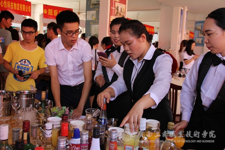 就業洽談會上,還安排了廣商院系列教學成果展演。酒店管理專業學生的西餐擺臺、中餐擺臺、餐巾花折疊、調酒表演等表演既展示出學生嫻熟的專業技能,也體現學院嚴謹專業的教學。同時,會計系學生在學生公寓架空層展示點鈔、珠算的技能,嫻熟的珠算打法,撥動的算珠敲擊著算盤框,聲聲連珠陣陣響,學生低頭認真點鈔,速度手法技巧令人折服。除此之外,書法與攝影作品展示,字跡工整,現場書法,吸引觀眾踴躍嘗試,題詞留下筆墨。學生各社團紛紛展示才藝,各展特色。