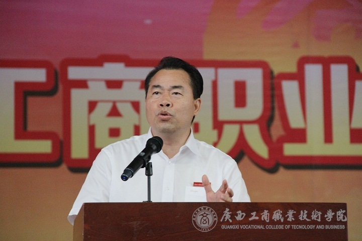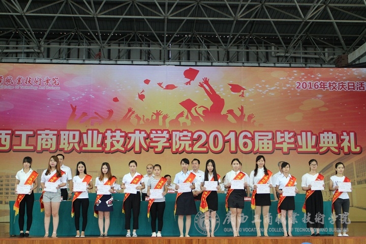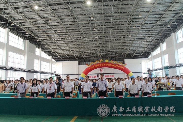 ??????? 又是紫荊花開時,又是一年畢業季,“學海浩瀚,憑誰鵬飛起航。光華歲月,任我青春飛揚。”悠揚激蕩的《廣商院之歌》不時在鵬飛路上空回蕩,燦爛的陽光輝映著廣商院美麗的校園,文體館內陣陣清風撲面而來。2016年6月26日下午,廣西工商職業技術學院2016屆畢業典禮在校本部文體館二樓隆重舉行。學院黨委書記覃武云、院長陳杰等校領導、學院各部門主要負責人出席,2016屆2200多位畢業生及班主任參加。畢業典禮由蒙啟成副書記主持。