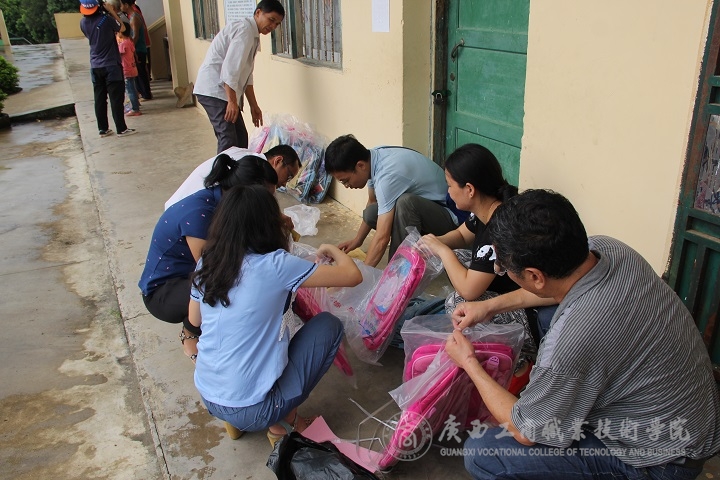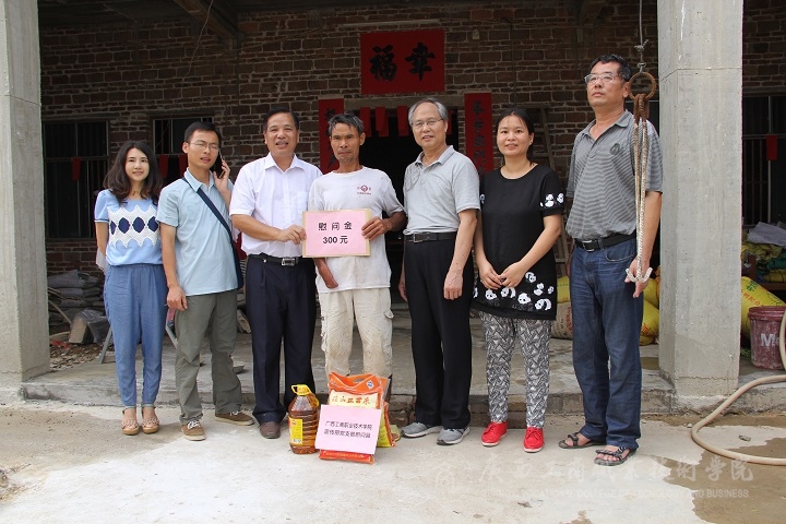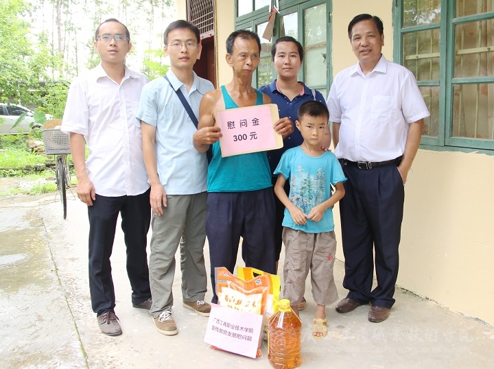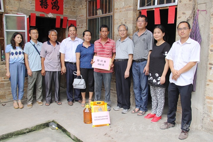 2016年7月8日,學院黃永蓬副廳級調研員率黨委宣傳部部長韋勝強、后勤管理處處長付光、宣傳部黨員教師等一行五人前往陸川縣看望駐四樂村第一書記羅北戰同志,走訪慰問該村老黨員、困難黨員、困難群眾,并為當地小學困難學子捐獻學習用品。
