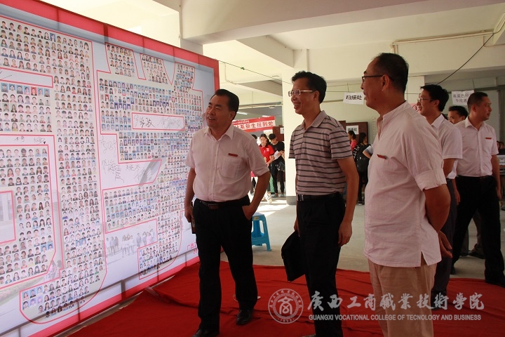 (陳杰院長(zhǎng)陪同韋尚英處長(zhǎng)參觀新生照片墻)