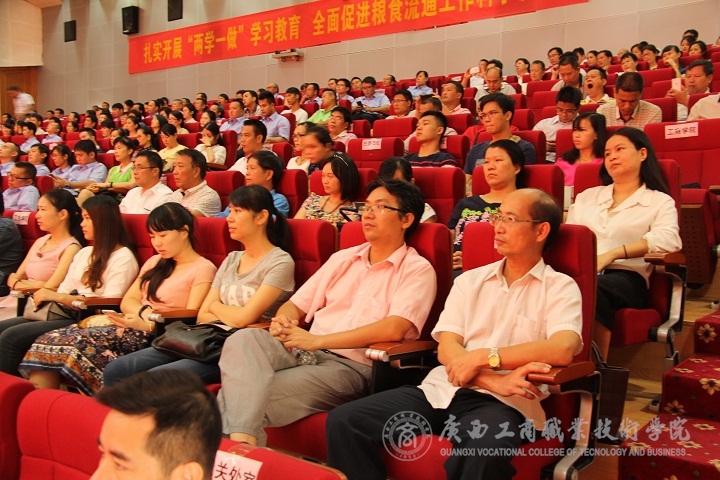 為弘揚柏鄉糧庫精神,深化糧食行業文化建設,深入開展“兩學一做”學習教育,9月20日,自治區糧食局邀請了全國糧食系統先進典型——河北柏鄉糧庫先進事跡宣講團來廣西南寧宣講,我院李維副院長、各單位、各部門科級以上干部代表及各系學生代表聆聽了報告。