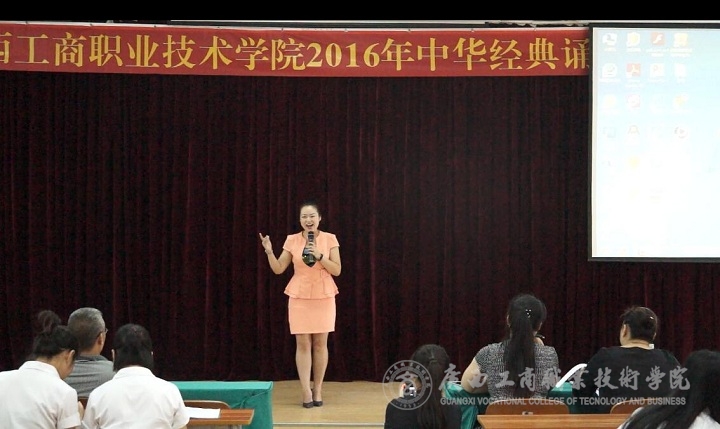 主持人簡單的介紹賽制后,比賽正式開始。第一位上場的學生組選手是來自經管系農梅園同學,作為大一新生他絲毫沒有羞澀和怯場,將《為你祝福,我的祖國》演繹的非常完整,為比賽開了一個好頭。第二位上場的是教師組選手賴婧婷老師,她誦讀的《一袋干糧》講述了紅軍戰士在艱苦的年代所體現的堅持與毅力。比賽中精彩不斷,學生組6號選手是由經管系的四位同學組成的團隊,他們先分再合的誦讀方式慷慨激昂,賺足了眼球:“……A:我深深地愛著我的祖國, 堅強的性格挺拔起泰山的氣魄;B:我深深地愛著我的祖國,遼闊的海疆裝滿了我所有的寄托;合:我的祖國,可愛的中國,你創造了輝煌的歷史,你養育了偉大的民族。”嘹亮的聲音響徹整個報告廳。教師組13號莫惘老師的誦讀融詩詞、音樂于一體,意境優美。24號劉佳家老師朗誦的《江城子.憶長征》、《念奴嬌.昆侖》將整個賽場觀眾的注意力全都吸引了過來……每位參賽選手的朗誦各有特色,或款款深情、或激情高昂,卻無一不展現出商院師生優秀的素質和良好的精神風貌。參賽選手一一誦讀完畢后,黃春平、陳亦愚、梁曉霞三位評委同臺朗誦《我的祖國》,給在場觀眾奉獻了一場中華經典詩文的視聽盛宴。