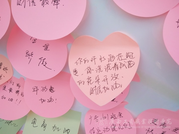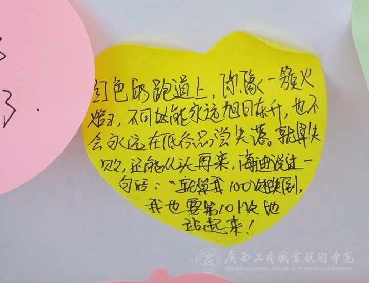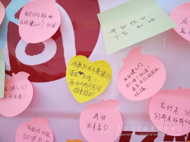 小小一張便利貼,記載著大家的祝愿與希望,在賽場上頑強拼搏,展現自我,用汗水與歡笑澆灌勝利的夢想,用行動成就希望。