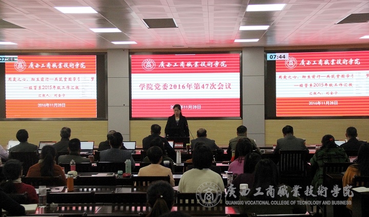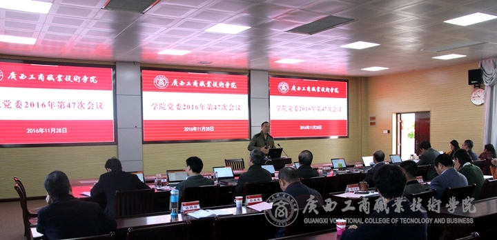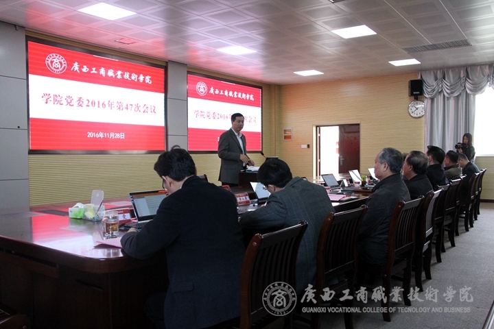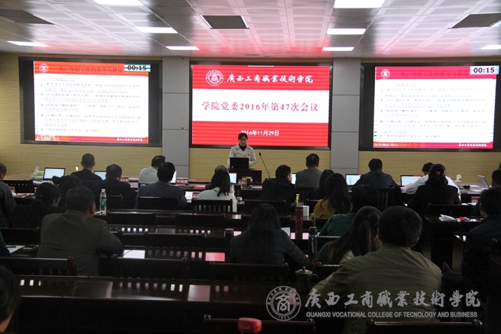 2016 年 11 月 28 日全天、29日下午,我院在校本部2119視頻會(huì)議室召開(kāi)第47次黨委會(huì),聽(tīng)取我院教改和教師專(zhuān)題匯報(bào)。學(xué)院黨委書(shū)記覃武云、黨委副書(shū)記、院長(zhǎng)陳杰、黨委副書(shū)記、紀(jì)委書(shū)記蒙啟成、黨委委員、副院長(zhǎng)李仕欽、黨委委員、副院長(zhǎng)李維、學(xué)院副廳級(jí)調(diào)研員黃永蓬、黨委委員、副院長(zhǎng)陳寧春出席會(huì)議,蔣百平、覃超穎、林雯等三位黨委委員共同參會(huì)。
