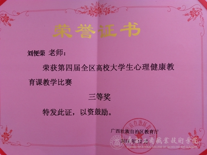 2016年12月9-11日,由廣西壯族自治區(qū)教育廳主辦的第四屆全區(qū)高校大學(xué)生心理講課教育課教學(xué)比賽在廣西師范大學(xué)(廣西大學(xué)生心理健康教育演講基地)舉辦。全區(qū)76所高校共有52位選手通過(guò)錄制視頻參與大賽,我院劉便榮老師參加并獲得了三等獎(jiǎng)。