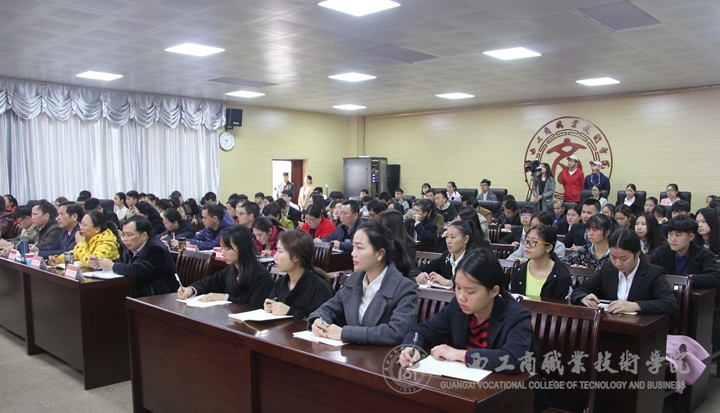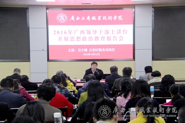 12月16日上午,2016年廣西領導干部上講臺開展思想政治教育報告會在我院校本部舉行。自治區糧食局黨組書記、局長吳宇雄同志作學習貫徹自治區十一次黨代會精神宣講報告。報告會由學院黨委副書記、院長陳杰主持,副院長李仕欽、副院長陳寧春出席報告會。