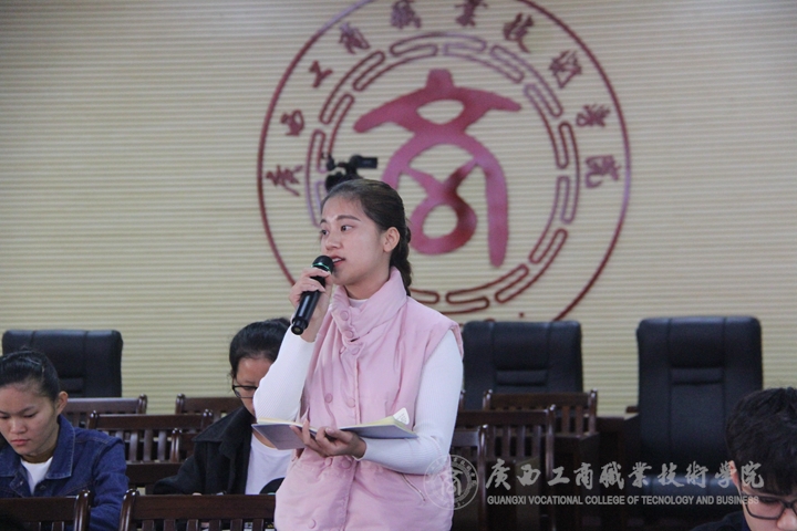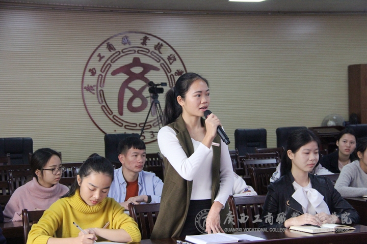 ??????? 隨后,師生代表就學習高校思想政治工作會議精神談了自己的學習體會。社科部黃森曼老師立足本職工作,談了學習習近平總書記講話的體會。她表示,通過學習會議精神,再次深刻感受到思想理論課的重要性;明白了立德樹人是思想政治教育課的立足點,黨的領導是思想理論課的方向,教師的自身素質是上好思想政治理論課的基礎。經管系學生代表提到,習近平總書記對共青團員干部提出了更高的要求。作為一名共青團干部要高度重視思想政治工作,做到跟黨走,聽黨話,努力提高專業知識與綜合素質,勤奮學習,積極工作,吃苦在前,享受在后,在同學中時刻起到先鋒表率的作用。
