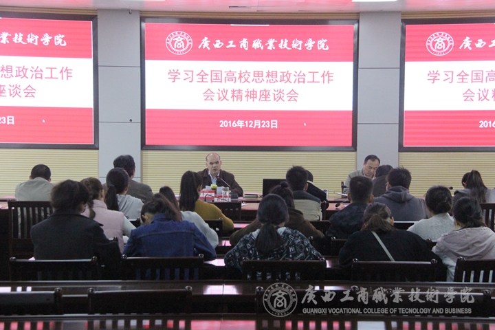 ??????? 2016 年 12 月 23 日上午,我院在校本部召開學習全國高校思想政治工作會議精神座談會。學院黨委書記覃武云,黨委副書記、紀委書記蒙啟成出席會議。黨委組織部、黨委宣傳部、黨委學生工作部、教務科研處、后勤管理處主要負責人,各系學生代表參加了此次會議。