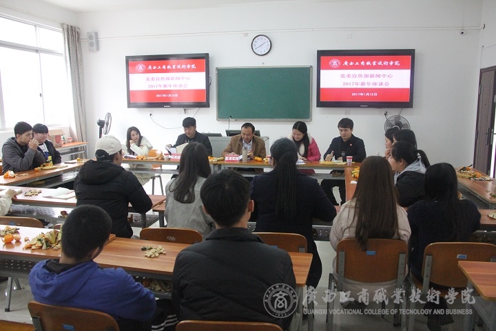 2017年1月12日中午,學院黨委宣傳部新聞中心在學院校本部召開2017年新年座談會,學院黨委副書記、紀委書記蒙啟成,學院黨委宣傳部部長韋勝強、黨委宣傳部助理陳宇寧出席會議,新聞中心指導老師莫惘、馮艷瓊、雷航,新聞中心15級重要骨干和16級新生代表參加了此次座談會。