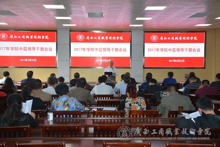 ? ? ? ? 2月22日下午,學(xué)院在校本部召開中層以上領(lǐng)導(dǎo)干部會議。學(xué)院黨委學(xué)校黨委書記覃武云同志、黨委副書記、紀(jì)委書記蒙啟成同志、學(xué)院副院長陳寧春同志出席會議。學(xué)院中層以上領(lǐng)導(dǎo)干部參加會議。會議聽取各部門主要負(fù)責(zé)人匯報2017年本部門的工作思路,包括黨建工作思路和行政工作思路。