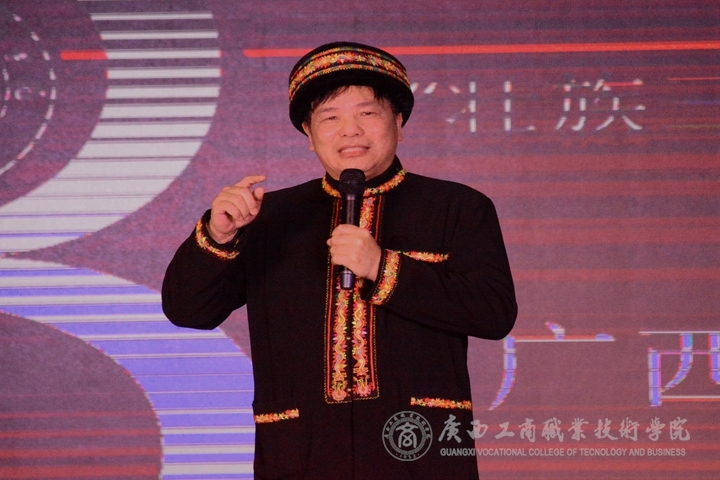 活動由傳說中的“瑤哥”,宣傳部部長韋勝強擔任主持人。他身著瑤族服裝,戴瑤族帽,一上場就給現場師生不一樣的視覺感受。介紹活動嘉賓和活動安排后,“瑤哥”含著笑將舞臺交給活動主講人蒙啟成副書記。