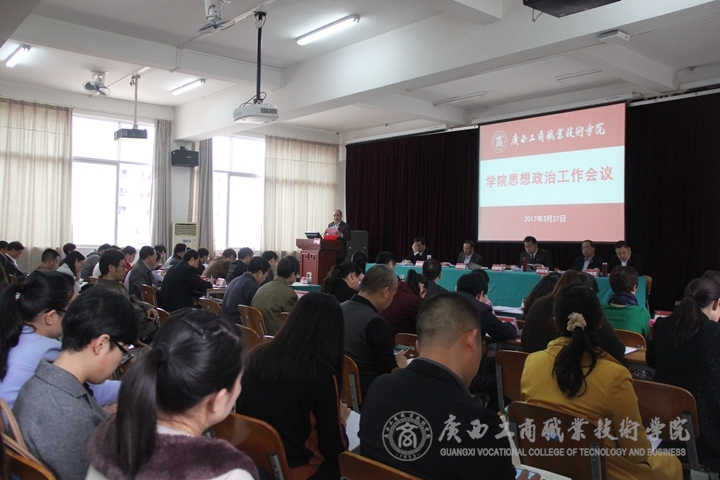 2017 年 3 月 27下午,我院于校本部教學樓報告廳召開思想政治工作會議。學院全體領導班子成員出席本次會議。學院黨委委員、紀委委員、各黨總支、直屬黨支部、各系教師黨支部、學生黨支部書記、副書記及委員、學院中層干部參加會議。