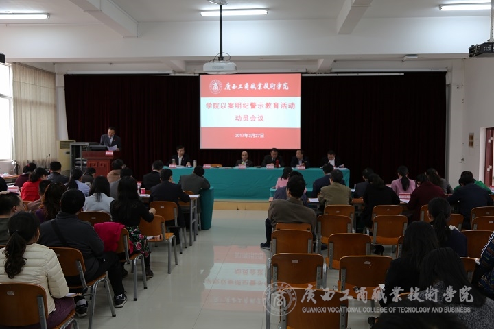 根據《關于印發自治區糧食局開展以案明紀警示教育活動實施方案的通知》(桂糧直紀〔2017〕7 號)精神,我院于 2017 年 3 月 27 日下午,在校本部報告廳召開學院以案明紀警示教育活動動員會議。學院全體領導班子成員出席會議,學院黨委委員、紀委委員;中層干部;各黨總支、直屬黨支部、各系教師黨支部、學生黨支部書記、副書記及委員參加會議。