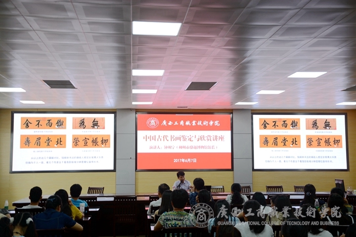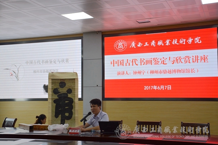 為豐富我院師生精神文化生活,2017年6月7日下午,我院在校本部舉辦中國古代書畫鑒定與欣賞講座。講座特邀請柳州市駱越博物館鐘州寧館長進行講解,學院教師和同學們參加本次講座。