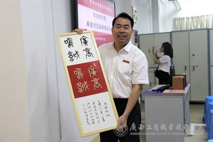 會議開始,陳杰院長邊講解藤瓷書藝邊讓老師、學生觀看學院首創的藤瓷書藝作品,接著是各位老師、學生代表發表個人對藤瓷書藝的看法及建議。有同學表示:自己原本對書法沒有過多的接觸,在看到這些書藝作品時卻產生想要接觸、了解的想法,并且認為藤瓷書藝應該不僅限于藤,還可以創新更多,比如說鋼絲,用鋼絲結合創作,不僅是書法更是可以做畫。