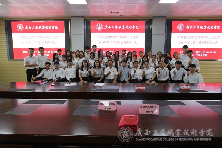 2017年6月30日下午,廣商院黨委宣傳部新聞中心學生部2017年度工作匯報會暨換屆大會在院本部召開。學院黨委副書記、紀委書記蒙啟成出席會議并講話。黨委宣傳部部長韋勝強、新聞中心指導老師莫惘、雷航,新聞中心全體成員及學院各大學生組織代表參加了本次大會。本次大會由新聞中心播主部副部長李柳娜主持。