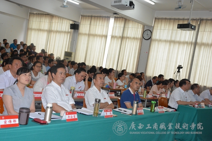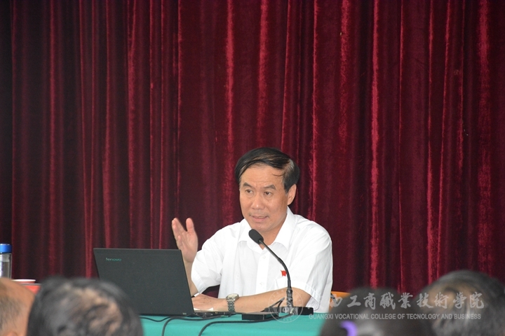 2017年7月11日(周二)下午,廣西工商職業技術學院全體教職員工齊聚校本部報告廳,召開學習貫徹習近平總書記視察廣西重要講話精神宣講報告會。報告會邀請自治區政協委員、廣西政協文史和學習委員會副主任(正廳級) 黃健教授作主題為《學習貫徹習近平總書記視察廣西重要講話精神》專題輔導報告。會議由學院黨委書記覃武云同志主持。