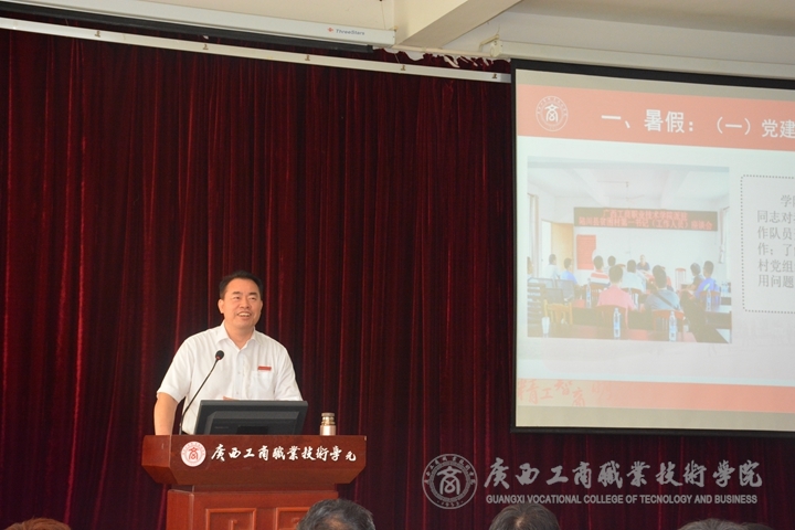 ?????? 隨后,由陳杰做開學工作報告。陳杰主要從暑假工作、開學工作、學期重點工作三大方面進行報告。他回顧總結了暑假期間黨建、教學、學工、人才、服務、民生、武鳴校區建設等各項工作開展情況,并做了開學工作及學期重點工作安排。報告將“堅持黨的領導,落實管黨治黨、辦學治校主體責任”等六項黨建工作和持續推動以“提高教師素質”為重點的教學水平升級等五項行政工作作為重點工作。