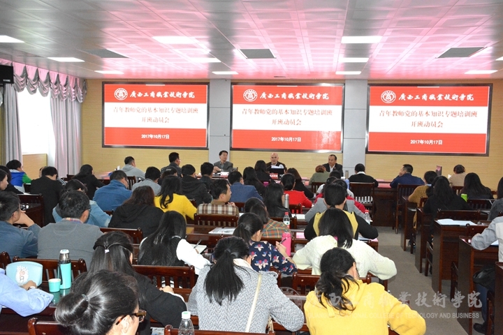 ? ? ? ? 2017 年 10 月 17 日下午,我院召開青年教師黨的基本知識專題培訓(xùn)班開班動員會,學(xué)院黨委書記覃武云作開班動員講話并主講題為《中國共產(chǎn)黨的歷史》(趕考及思考)專題理論學(xué)習(xí)第一課。本次動員會由學(xué)院黨委副書記、紀(jì)委書記蒙啟成主持,學(xué)院 35 歲以下(含 35 歲)全體青年教師共110多人作為學(xué)員參加了動員會。