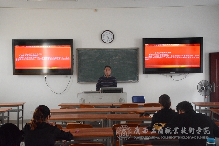 ? ? ? ? 10月18日和25日黨的十九大召開和中央政治局常委與記者見面會的當天,學校組織師生在報告廳、教室、餐廳等場所收看現場直播,親耳聆聽習近平總書記的報告和講話。11月1日,學院黨委召開十九大精神學習會,黨委書記、院長和學院領導帶頭學、帶頭談體會。黨委書記覃武云說,偉大思想源于偉大擔當、偉大實踐和人民群眾的高度認可,黨的十九大報告是我們黨邁進新時代、開啟新征程的政治宣言,是舉旗定向、謀篇布局的奮斗綱領,習近平新時代中國特色社會主義思想是凝神聚力、興黨強國的行動指南,全校要全面準確地學習領會黨的十九大精神,要堅持立德樹人,全面實現我院教育事業內涵式發展。