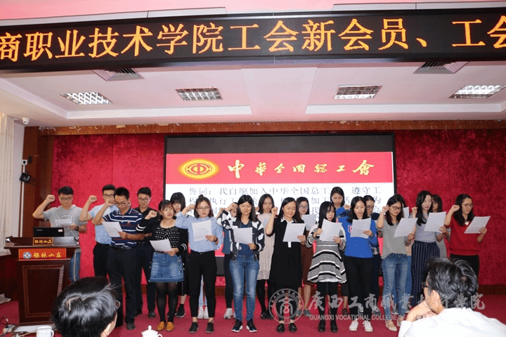 ? ? ? ? 近日,學院工會在南寧市會議中心第二綜合會議室舉辦了新會員、工會干部培訓班暨新會員入會儀式。學院工會主席蒙啟成、常務副主席陳承偉、專職副主席王桂玲及學院工會干部和新會員參加了本次培訓。本次培訓由學院工會常務副主席陳承偉主持,王桂玲副主席代表學院工會向新會員的入會表示歡迎和祝賀,同時圍繞工會的基本職能、會員的權利與義務以及黨的十九大精神、習近平總書記談工會等方面,為全體參訓人員作了深入細致的講解,并就計生工作方面的相關知識,向新會員作了介紹。最后,蒙啟成主席發表講話,要求全體工會干部要以高度的政治責任感和歷史使命感履職盡責,做好“四種人”, 團結引領廣大職工群眾聽黨話、跟黨走,建功立業, 以實際行動迎接新時代,展現新作為。