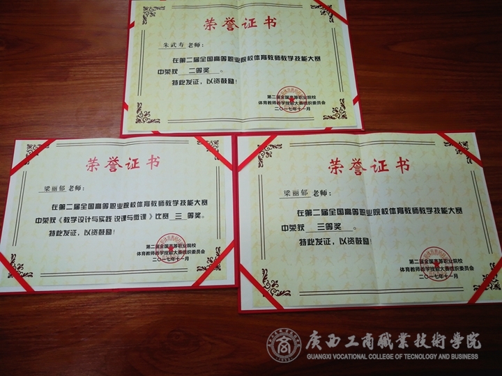 2017年11月23日至27日,第二屆全國高等職業院校體育教師教學技能大賽在江蘇省蘇州市舉行。在比賽中,我院朱武壽老師以80.42分獲得中年組體育教師技能大賽二等獎,梁麗郁老師以79.33分獲得青年組體育教師技能大賽三等獎、以85.36分獲得《教學設計與實踐 說課與微課》比賽三等獎。