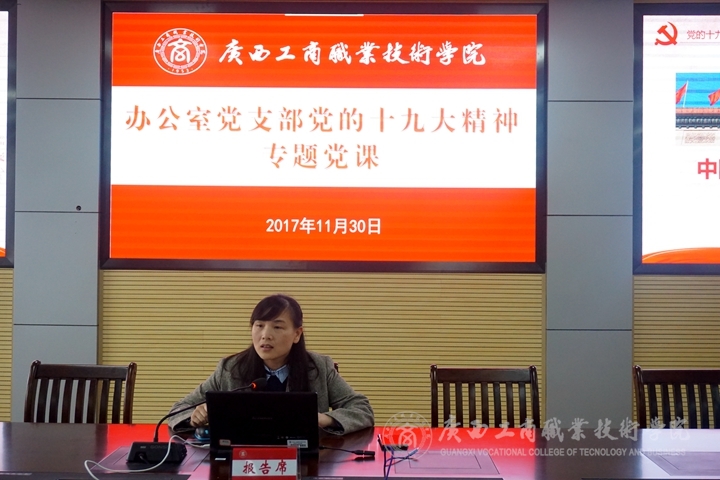 ? ? ? ? 根據學院十九大精神學習安排,辦公室黨支部于11月30日下午在2119視頻會議室組織舉辦了學習黨的十九大精神專題黨課。此次黨課由辦公室黨支部書記覃遠霞主持,院長陳杰和覃遠霞分別上了一節黨課,部門全體人員參加。