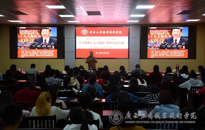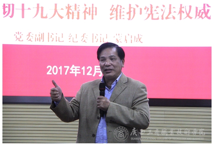 ? ? ? ? 12月4日晚,我院在校本部會議室舉辦學習貫徹十九大精神,維護憲法權威知識講座。本次講座由學院黨委副書記、紀委書記蒙啟成主講,黨委宣傳部部長韋勝強主持。學院各系學生代表參加講座。