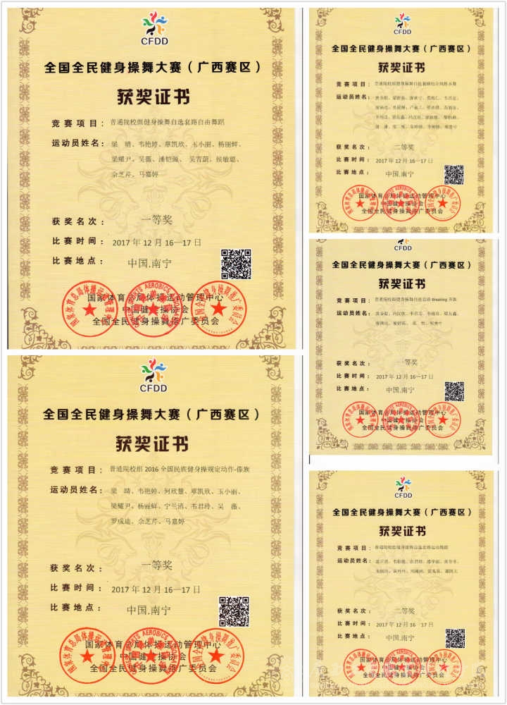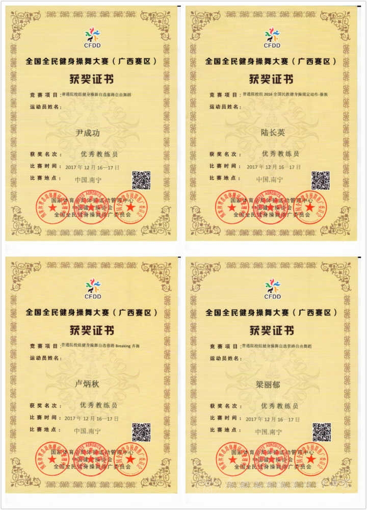 ??????? 此次比賽,學院高度重視,組成了由尹成功老師為總教練(全國健身操舞國家一級裁判員、教練員),盧炳秋、陸長英和梁麗郁老師為助理教練的團隊。經(jīng)過精心選拔的46名運動員共報名參加大學普通院校組的五個比賽項目。在教練員團隊的悉心指導下,運動隊員緊密協(xié)作,發(fā)揮出色,在大學普通院校組比賽中,榮獲街舞Breaking自選動作項目一等獎,2017年全國民族健身操規(guī)定傣族動作項目一等獎,民族健身操舞自選套路自由舞蹈項目一等獎,綜合齊舞風格項目二等獎,運動舞蹈項目二等獎。同時在此次比賽中,教練團全體教師均榮獲 “優(yōu)秀教練員”。